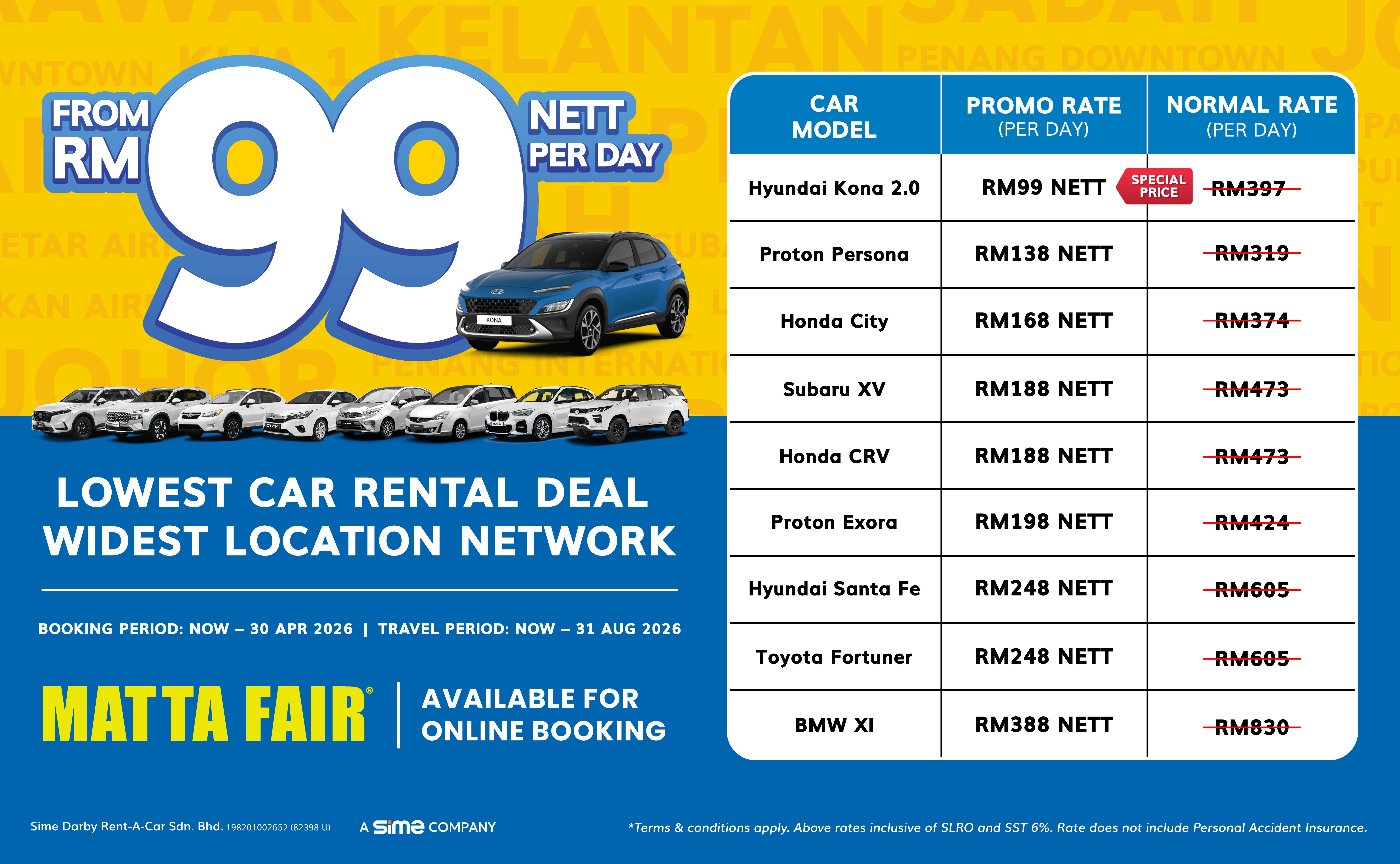 Book Hertz Malaysia car rental from RM99/day at MATTA Fair 2026. Wide network, low rates, and exclusive travel deals across Malaysia.
